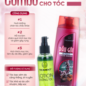 Combo ngăn lão hóa tóc bạc sớm Thorakao – Giải pháp kép cho mái tóc chắc khỏe & trẻ lâu. Sự kết hợp của Dầu gội xả 2in1 Hà Thủ ÔLotion xịt dưỡng tóc tinh dầu bưởi giúp làm sạch, nuôi dưỡng, kích thích mọc tóc, đồng thời hỗ trợ làm chậm quá trình bạc tóc, giảm gãy rụng, trả lại mái tóc dày khỏe và tràn đầy sức sống.